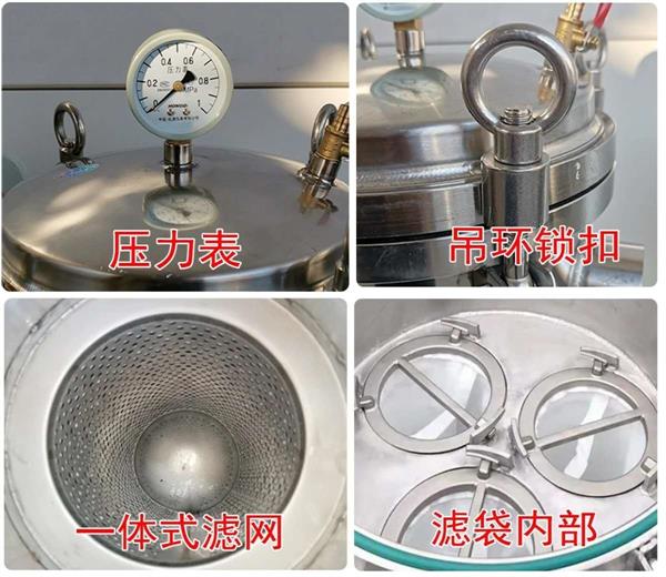 袋式過濾器是一種壓力式過濾裝置,主要由過濾筒體、過濾筒蓋和快開機構(gòu)、不銹鋼濾袋加強網(wǎng)等主要部件組成,濾液由過濾器外殼的旁側(cè)入口管流入濾袋,濾袋本身是裝置在加強網(wǎng)籃內(nèi),液體滲透過所需要細(xì)度等級的濾袋即可獲得合格的濾液。